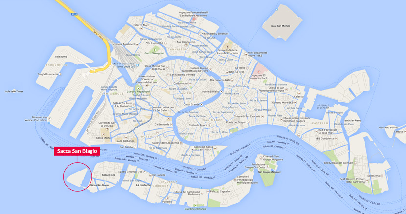 Sacca San Biagio is located near the entrance to the Giudecca Canal and the island of Sacca Fisola: